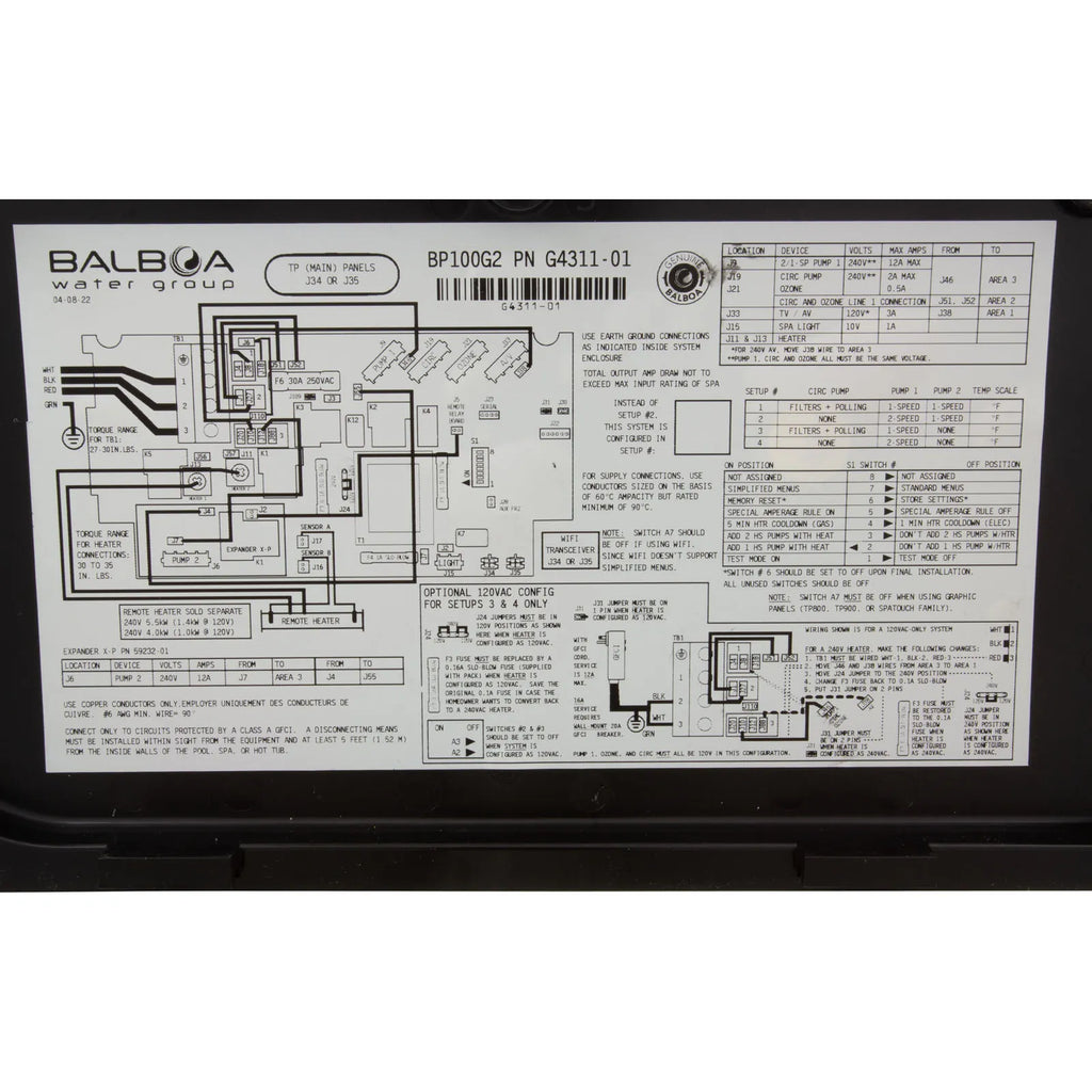 *The Balboa BP100G2 is factory configured for 240 volt applications, pump(s) and ozonator must be 240 volts.